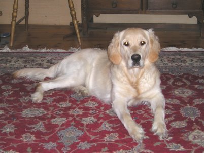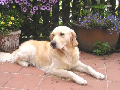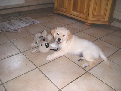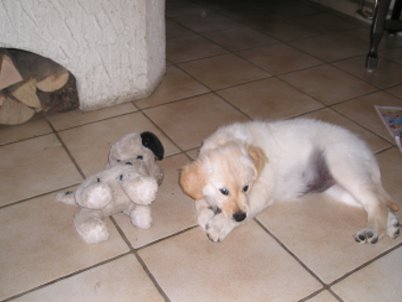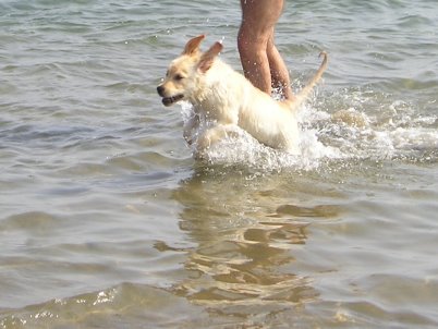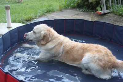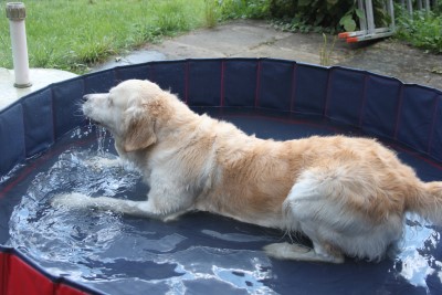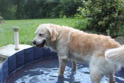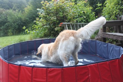 Abby weiht unseren Doggy-Pool ein im Sommer 2011 Naja, etwas mehr Wasser könnte hier schon rein, hier werden ja nur die Füße nass. Mal sehen ob es trotzdem schön ist