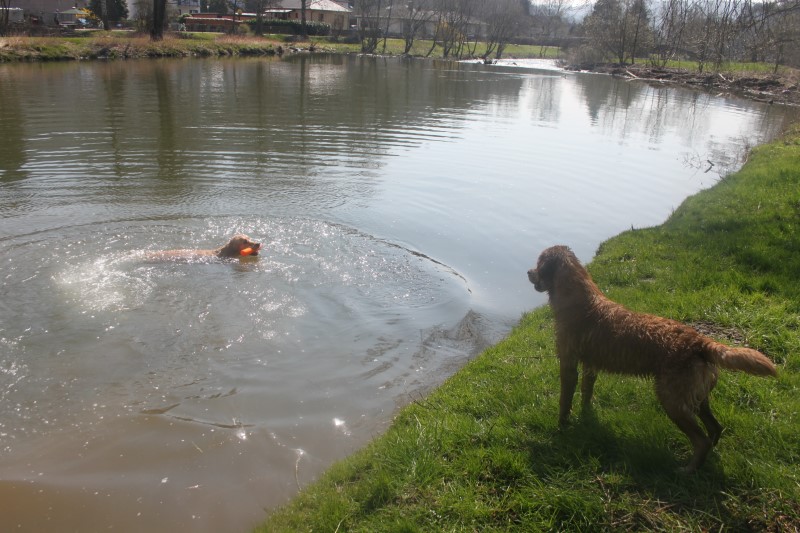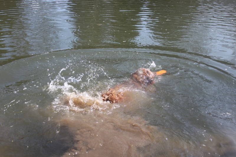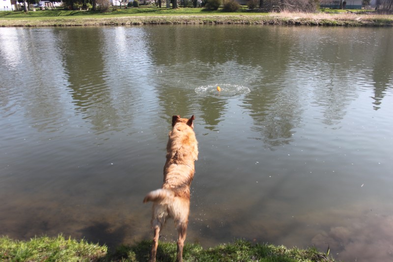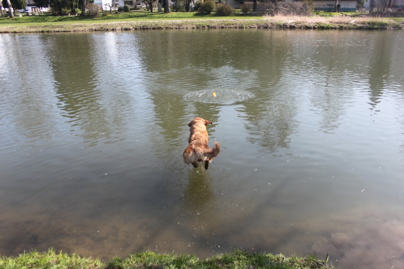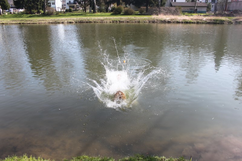 Das Joychen ist ein wilder Feger, sie guckt nicht lange und springt gleich mit einem Riesensatz ins Wasser