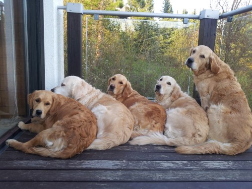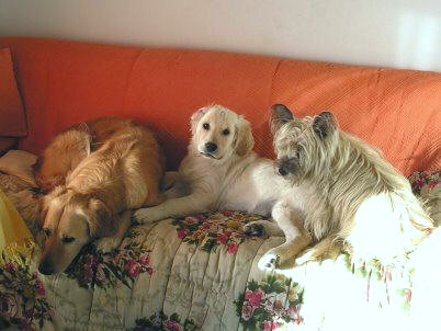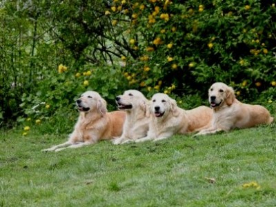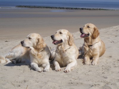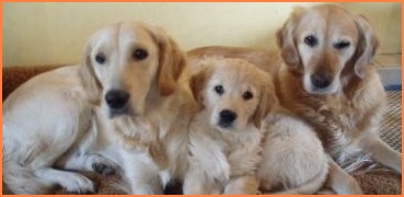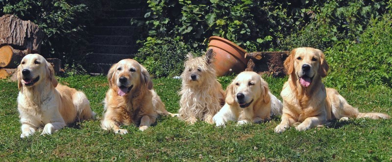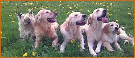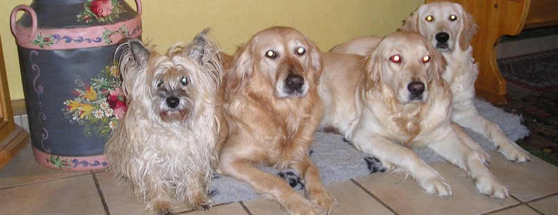 Seit kurzer Zeit haben wir also nun noch einen Golden in unserer Familie. Von meinem B-Wurf habe ich eine Kleine behalten. Best Cimberly heißt sie und ist wirklich allerliebst. Sie hatte keine Probleme sich einzuordnen. Abby (4) - ihre Tante - spielt gerne mit ihr und Bonnie (3) - ihre Mama - sowieso. Sammy unsere ältere Dame (10) hat ihr am Anfang gezeigt, dass sie sich nicht so frech anmachen läßt wie ihre Mama und ihre Tante. Das hat sie schnell kapiert und jetzt sind die zwei ganz lieb miteinander. Sammy "opfert" sich nun schon zum dritten Mal und übernimmt den ruhigen, souveränen Teil im Rudel. Bei ihr fühlen sich die Kleinen immer sicher aufgehoben. Gipsy (12 1/2) behauptet sich und besteht auf ihr Recht. "Komm mir bloß nicht zu nah, ich weiß schließlich wie groß Du wirst und das ist dann nicht mehr so witzig".